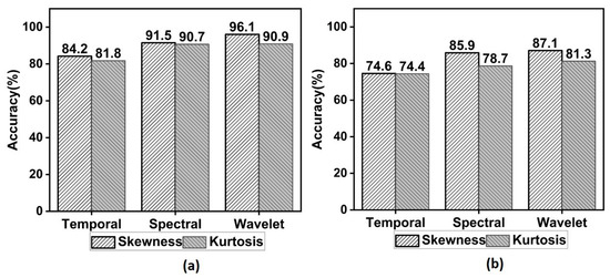 Table 2 lists the optimized parameter values, along with the accuracy. It was found that the temporal skewness and kurtosis obtain the best feasible points when the parameters (C, ℽ) were at (6.3, 10.4) and (2.43, 7.65) respectively. For temporal skewness, it took 124 milliseconds to reach the best minimum objective function value of 0.1192. Temporal kurtosis model could obtain the minimum function value of 0.14132 in 138 milliseconds. Similarly, the model based on spectral skewness has obtained the feasible objective function value of 0.0141. At this point, the hyperparameter values were 6.86 for C and 7.18 for ℽ. The time taken to complete the optimization process was 138 milliseconds. For the model based on spectral kurtosis, the minimum value of objective function is 0.134 and its hyperparameters were 1.5 (C) and 2.74 (ℽ). Figure 7 depicts the optimization process of models based on the wavelet skewness and kurtosis in 30 evaluations. From these results, it can be observed that the box constraint and kernel scale values of wavelet skewness are lower than the skewness from temporal and spectral domain. It can be seen that the wavelet skewness yields a maximum accuracy of around 96% for C = 2.84 and ℽ = 6.34. Overall, the detection rate increased by about a minimum of 9% after optimization. It was also found that the performances of wavelet kurtosis and spectral skewness and kurtosis were considerably improved due to the Bayesian optimization.