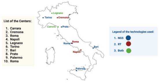 List of participating centers in this study. The techniques used in each center are color coded.