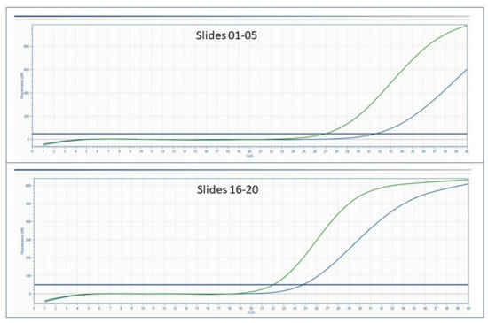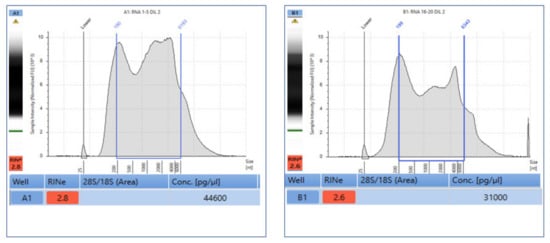 After the deparaffinization protocol, RNA was directly extracted from the selected slides. In addition, to check the quantity of RNA, two sets of slides representative of the first and last cell-block sections were analyzed in order to verify the neoplastic cell content during FFPE processing. Briefly, RNA was quantified and qualified on both slide sections. Quite similar RNA amounts of 44.6 and 31.0 ng/µL were obtained from the first and second slide set, respectively. In addition, matched RIN values of 2.8 and 2.6 were obtained (Figure 2).