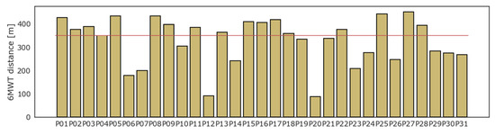 All patients underwent the 6MWT. On average, patients walked 328.9 (SD ± 99.5) m, while 14 (45%) patients could not walk a distance greater than 350 m. Four patients interrupted the test before 6 min due to the onset of moderate symptoms or inability to continue: P06 stopped at the fourth minute, P23 at the third, while P12 and P20 managed to endure the test for just two minutes. The result of the 6MWT for each patient is displayed in Figure 2.