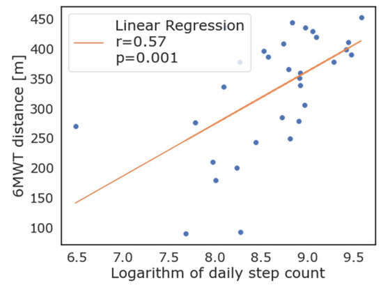 As evident from Figure 3, most patients that exceeded the 350 m threshold of the 6MWT also walked more than 10,000 steps per day on average, while only four of this group did not. When logarithmic transformation of the number of steps walked daily is applied, there was good correlation with the 6MWT performance (R = 0.56, p = 0.001). Correlation between the logarithmic transformation of daily step count and the 6MWT is reported in Figure 4. As depicted in this figure, the logarithm of the daily step count demonstrated good correlation with the 6MWT results (total walked distance), with r = 0.57 and p = 0.001.