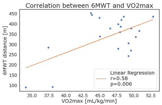 Considering the patients with positive values, the weekly average of 𝑉𝑂2𝑚𝑎𝑥 as reported by the WD correlated strongly with the results of the 6MWT. As depicted in Figure 6, the maximal oxygen consumption (VO2 max) showed a high correlation with results from the 6MWT (walked distance in meters), with an r = 0.58 and p = 0.006.