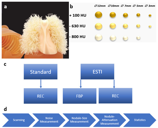(a) Photo of the anthropomorphic chest phantom (Lungman Phantom, Kyoto Kagaku Co. LTD, https://www.kyotokagaku.com/en/products_data/ph-1_01/), access date: 7 February 2023. (b) Schematic overview of the lung nodules which were randomly placed in the phantom. (c) Scheme of scanning protocols with respective reconstructions. (d) Flow-chart of data processing and evaluation. Hounsfield units (HU). Filtered back Projection (FBP). Vendor-specific advanced reconstruction algorithm (REC). European Society of Thoracic Imaging (ESTI).