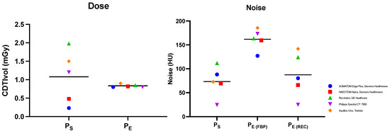 As Goldman [20] explains, image noise is one of four basic factors (the others being spatial resolution, image contrast, and artifacts) which influence image quality in CT scans and if reduced, may improve the visibility of low-contrast structures. Currently, in low-dose CT iterative reconstruction, algorithms are used to decrease image noise in order to obtain diagnostic images despite the low dose [21,22,23]. As expected, our study image noise was lower in images reconstructed with iterative reconstruction algorithms than in those reconstructed with FBP. Between PS and PE(REC), there was no statistically significant difference in image noise.
