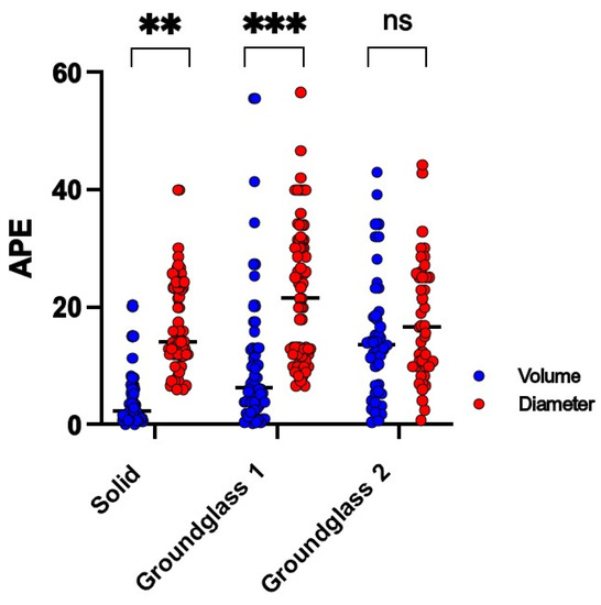 Absolute percentage errors (APEs) of quantified nodule volume and diameter. Nodules were separated and categorized according to density as solid, ground-glass 1 or ground-glass 2. The asterisk signifies the level of significance in APE difference between volume (blue) and diameter (red) measurements (**: p < 0.001; ***: p < 0.0001), whereas no significant difference (p > 0.05) is labeled as “ns”. Every dot represents the APE of a single measurement in its respective category.