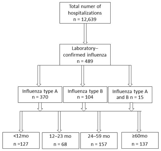 During the analyzed period (87 consecutive months) there were 12,639, and 489 children were diagnosed with laboratory-confirmed influenza, corresponding to 3.9% of the total number of hospitalizations. A flowchart of the patients is shown in Figure 1. The group consisted of 262 boys and 227 girls, with a median age of 34 months (IQR: 11–63 months); the patients were divided into age groups: there were 127 infants under 12 months of age, 68 children aged 12–23 months, 157 children aged 24–59 months, and 137 children aged 5 years or more.