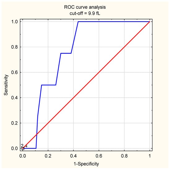 The results of the ROC curve analysis of MPV in the prediction of tertiary care unit transfer; the calculated area under the curve reached 0.77 (95%CI: 0.64–0.89, p < 0.01), and the optimal cut-off value was calculated with the Youden index; the blue line shows the ROC curve, while the red line is the reference line.