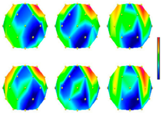 Figure 2 shows the brain power maps captured in the frequency range between 8 and 12 Hz. These maps correspond to the three above-stated imagined mental tasks of the BCI competition III dataset V belonging to one subject. These maps were taken by [17] for two consecutive recording sessions that are shown in the top panels and bottom panels of Figure 2, respectively. The mean value of all the EEG data for a particular mental task was calculated as movements (left panels) and then used to make maps. The left panel depicts the imagination of the left hand. The imagination of the right hand movements is shown in the central panels while the task of imagining word generation starting from the same random letter corresponds to the right panels in Figure 2. In this figure, the filled circles represent the electrode placement (frontal on top). Figure 2 shows that the brain maps of the given imaginary mental tasks and the corresponding EEG data showed similar results in different sessions. Specifically, this can be observed for the task of imagining left hand and right hand movements. It was observed in [17] that the power map of the “right” task recorded during the second session was similar to the power map of the “left” task recorded during the first session. This shows that the variability present in the EEG data between different sessions hampers accurate predictions.