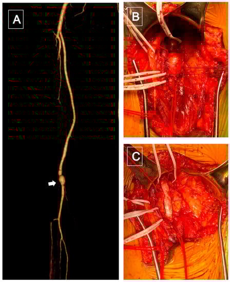 (A), CTA volume rendering reconstruction showed a popliteal (P2) saccular aneurysm (white arrowhead). (B) Intraoperative: popliteal aneurysm exposure using a posterior surgical access. (C) Popliteal reconstruction with a bypass using a 7 mm polytetrafluoroethylene (PTFE) graft.