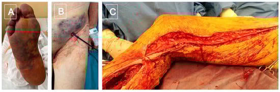 In presence of an adequate patent lumen, adequate run-off, and good landing zones, the placement of an endograft (Gore Viabahn TM) was performed immediately after the mechanical thrombectomy. Nevertheless, in case of a suboptimal result after the mechanical thrombectomy, adjunctive fibrinolytic infusion was performed, and the stent placement was delayed to a good patent lumen achievement (Figure 2). The protocol for fibrinolytic infusion was intra-arterial locoregional low-dose Urokinase from 5000 to 7000 UI/hour, with associated unfractionated heparin infusion, for at least 48 h. Coagulation was tested every 6 h in patients under thrombolytic infusion. In case of a less than 80% basal level of antithrombin III, 500 U of antithrombin III was infused for 10 min before starting the continuous intravenous heparin to reach an activated partial thromboplastin time between 2 and 3 s. Whenever the endovascular approach was contraindicated or failed, a classic open surgical approach with a Fogarty distal embolectomy, (Le Maitre, Burlington, MA, USA) followed by a femoro-popliteal bypass were performed (Figure 3). Before arterial clamping, routinely 100 UI/kg of intravenous heparin and antibiotic prophylaxis were administered.