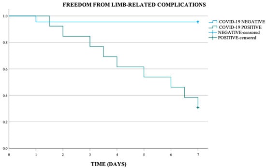 Kaplan Meier analysis performed showed an overall freedom from limb-related complications at 7 days of 71.4%, of 95.5% in the COVID-19 negative population and of 30.8% in COVID-19 positive population. This difference was statistically significant (p-value < 0.001) (Scheme 1).