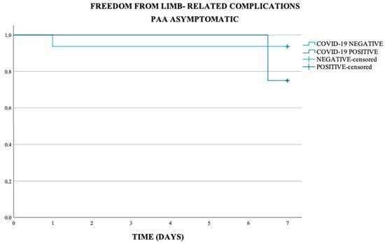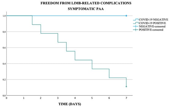 In the asymptomatic and symptomatic PAA subgroup, the freedom from limb-related complications at 7 days was respectively of 90% and 46.7%, in the COVID-19 negative population respectively of 93.8% and 100% and in COVID-19 positive population respectively of 75.0% and 11.1% (p-value < 0.001) (Scheme 2 and Scheme 3).