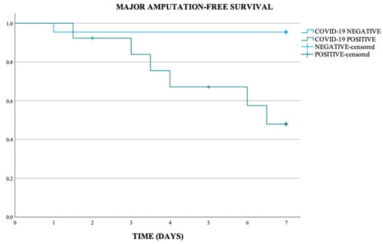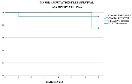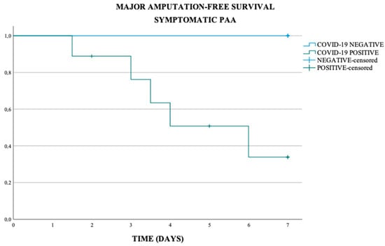 In the asymptomatic and symptomatic PAA subgroup, the major amputation-free survival at 7 days was respectively of 90% and 66.7%, in the COVID-19 negative population respectively of 93.8% and 100%, and in COVID-19 positive population of 75.0% and 44.4% (p-value < 0.011) (Scheme 5 and Scheme 6).