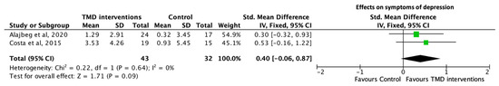 | Depression | 2 | [19,20] | 43 | 32 | 0.40 (−0.06–0.87) | 0.09 | 0%; 0.22; 0.64 |