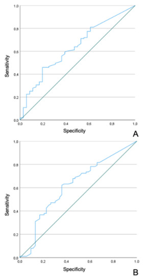 Regarding the LN ratio, the analysis of the ROC curve obtained statistically significant results predicting OS (AUC 0.636, CI 95% 0.534–0.737, p = 0.015), with the best cutoff value at 0.009803922 (sensitivity 81.1%; specificity 36.1%) (Figure 1a). For DFS, results were also significant (AUC 0.620, CI 95% 0.522–0.717, p = 0.018), with the best cutoff value at 0.009803922 (sensitivity 81.6%; specificity 32.1%) (Figure 1b).