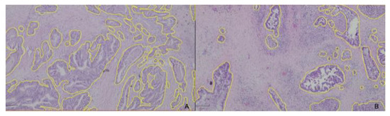 Figure 2a,b shows histological images of PDAC, where the glandular areas were delimited. The remaining image corresponds to the tumor stroma.