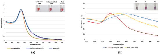 The absorbance spectrum of GNP samples along with tube images in the inset: (a) The absorbance spectrum of the synthesized GNPs, surface-modified GNPs, and test sample after the heating cycle and (b) proof-of-concept of the biosensor using the blaKPC probe with negative control (NC), target (T), and non-target (NT) samples.