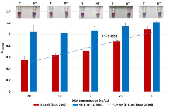 The lowest detection limit of the biosensor for KPC-producing bacteria was determined using the target DNA of KPC-producing E. coli (BA-2340) and the non-target DNA of susceptible E. coli C-3000. Both target and non-target DNA samples were diluted from 20 to 1 ng/μL by a factor of two. Target and non-target DNA samples at the same concentrations were compared using absorbance spectra measurements; tube images are shown in Figure 2. Quantification of GNP aggregation was achieved using A625/520. The difference in average A625/520 of target and non-target samples was higher at 20 ng/µL and 10 ng/µL followed by 5 ng/µL and 2.5 ng/µL. The least difference between the target and non-target samples was observed at 1 ng/μL. Statistically significant differences between target and non-target samples for each concentration were assessed using ANOVA followed by Tukey’s test. The target samples at 20 ng/µL, 10 ng/µL, 5 ng/µL, 2.5 ng/µL, and 1 ng/μL were significantly different from their non-target samples (p < 0.05). However, the average A625/520 of the target sample at 1 ng/μL overlapped with non-target samples at 20 ng/µL, 10 ng/µL, 5 ng/µL, 2.5 ng/µL, which were all similar (p > 0.05). Further, visual detection at 1 ng/µL was also not clearly observed. Thus, the detection limit was found to be 2.5 ng/µL.