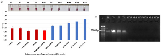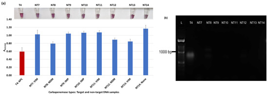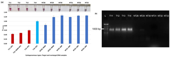 Plasmonic biosensor and PCR results of E. cloacae samples: (a) the average absorbance ratio at 625 and 520 nm (A625/520) of the target (T) and non-target (NT) samples, with colorimetric results in tubes. Detected target samples are shown with red color bars, and non-target samples are shown with blue bars. (b) PCR amplification results of the same samples with a 1000 bp ladder.