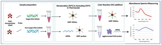 Generalized procedure of GNP-based plasmonic biosensor (created with BioRender.com, accessed on 12 January 2023).