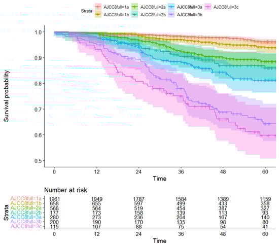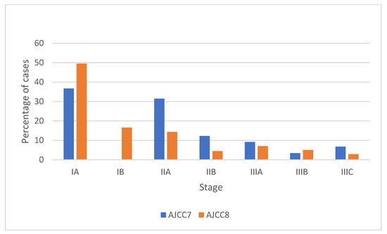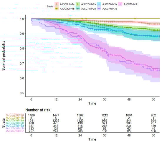 The following supporting information can be downloaded at https://www.mdpi.com/article/10.3390/diagnostics13040674/s1: Table S1: Assessment of the proportional hazards assumption, where a value of less than 0.05 indicates the proportional hazards assumption is violated. Table S2: 5-year overall survival rate by AJCC7 stage and AJCC8 stage. Figure S1: Kaplan Meier survival curves for 5-year overall survival rate among upstaged, downstaged and unchanged patients (AJCC7 to AJCC8).