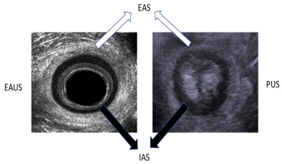 Mid-anal canal image in EAUS (left image) and axial view on PUS (right image). EAS—external anal sphincter. IAS—internal anal sphincter.