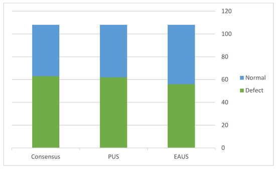 After discussing the discordant cases, the final consensus identified the diagnosis of 61 (56%) muscular defects and 47 (44%) normal exams (Figure 3). Therefore, combining the two imaging modalities enabled the detection of muscle defects in 10 cases (16%) missed by the sole use of 3D EAUS and two cases (3%) missed by TPUS. Table 2 summarizes the comparison of 3D EAUS results to that of the final consensus.