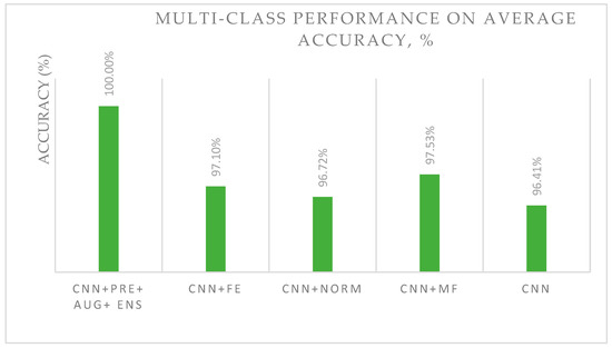 For multi-class classification, studies have used a CNN with pre-processing, augmentation, and ensemble (CNN + PRE + AUG + ENS); a CNN with feature extraction (CNN + FE); a CNN with model fusion (CNN + MF); a CNN with normalization (CNN-Norm); and a CNN alone. Figure 3 demonstrates the performance of DL variants for multi-class histopathological image classification. The CNN + PRE + AUG + ENS model outperformed other methods, with an accuracy of 100%.