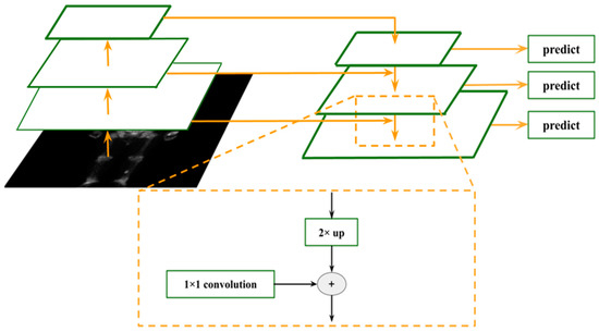 On the basis of Faster R-CNN ResNet, the FPN module is introduced, which uses the feature pyramid characteristics of CNN to simulate the image pyramid function, so that RPN and Fast R-CNN can be used in the multiple scale level feature map. Predicting objects of different sizes considerably improves the detection ability of Faster R-CNN. The inference time is saved compared with that of image pyramids. The principle is illustrated in Figure 5.