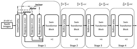 In the T2S-Transformer, there are four stages trained end-to-end. In stage 1, each patch of a tooth image with a size of (dimension 16) is treated as a “token” such as the ViT model. A linear embedding layer is applied on each patch to project it into an arbitrary dimension such as 96 in our experiments. The main difference between the T2S-Transformer and the naive swin transformer (S-Transformer) is the linear embeddings used, where there are three channels when a batch of input tooth images consisting of canine, molar and incisor.