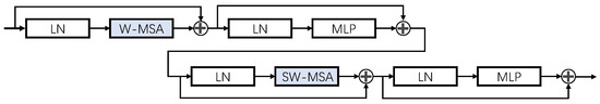 where and are the outputs of W-MSA and SW-MSA, respectively, and are the outputs of the l-th and -th layers, respectively, and . MLP is a two-layer multilayer perceptron. W-MSA and SW-MSA are the regular and shifted windowing multi-head self attention modules based on the patch-merging module [27].