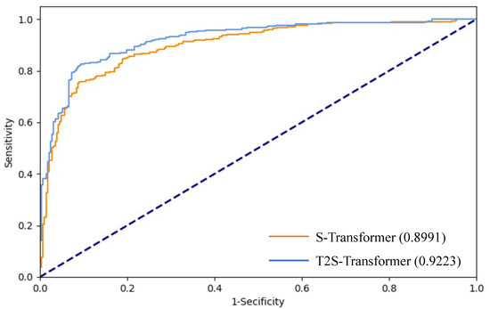 Receiver operating characteristic (ROC) curves of the proposed T2S-Transformer and the naive S-Transformer. Numbers in parentheses show the AUC values of the two methods.