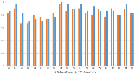 Classification accuracy of each tooth for the proposed T2S-Transformer and the naive S-Transformer. Numbers in the horizontal ordinate denote the tooth positions.