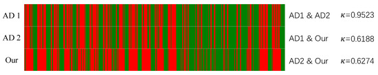 To measure the agreement between the observations of the two doctors, we plot the observations along with the kappa value, as shown in Figure 6. It can be seen that the kappa value of the two attending doctors is 0.9523, indicating almost perfect agreement. The kappa values of the proposed method and each dentist are also calculated (0.6188, 0.6274), showing substantial agreement.