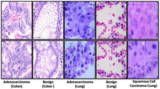 This paper used the histopathological images (LC25000) dataset created by A. Borkowski and his associates and published in 2020 [37]. This collection contains 25,000 photos of lung and colon tissues divided into five groups. It has 25,000 photos, of which 15,000 are of lung cancer and 10,000 are of colon cancer. Squamous cell carcinoma, benign, and adenocarcinoma are the three different forms of lung tissue pictures. In contrast, colon pictures fall under benign tissues and cancer groups. The LC25000 dataset was developed utilizing a sample of HIPAA-compliant. It verified references, including 750 lung tissue (250 adenocarcinomas, 250 squamous cell carcinomas, and 250 benign tissue) and 500 colon tissue (250 adenocarcinomas and 250 benign tissue) augmented to create 25,000 images. The dataset was increased by flipping and rotating the photographs under various conditions; as a result, the dataset was separated into five categories with 5000 images each. There are now 25,000 images in the dataset. Images were scaled to 224 × 224. Figure 1 shows samples of histopathological images from the dataset.