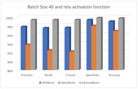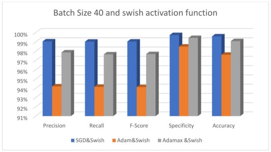 Figure 3 displays the performance of the suggested model using three different optimizers—SGD, Adam, and AdaMax—while keeping Swish as the activation function and 40 as the batch size. Figure 4 displays the effectiveness of the suggested model using the same varied optimizers with the activation function changed only to ReLU. Figure 5 shows that the SGD optimizer provides the best performance compared to other optimizers. Adam has the lowest accuracy results since it requires many hyperparameters and iterations. Moreover, it is sensitive to feature scaling.