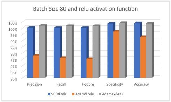 The effectiveness of the suggested model using various optimizers is shown in Figure 7. The SGD, Adam, and AdaMax optimizers have their batch size fixed at 80 and the activation function set to ReLU. It is obvious that the AdaMax optimizer performs better than the other optimizers. Adam also notes the worst performance when the batch size is 80 and the ReLU activation function is used.