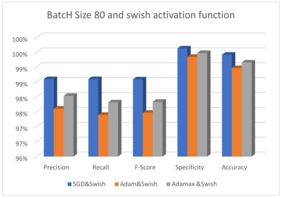 The effectiveness of the suggested model using different optimizers is shown in Figure 5. The SGD, Adam, and AdaMax optimizers have their batch size fixed at 40 and the activation function set to ReLU. It is obvious that the AdaMax optimizer performs better than the other optimizers. Adam also has the worst results when the ReLU activation function is used. Figure 6 displays the performance of the suggested model with the same optimizers, the batch size set to 80, and the activation function fixed at Swish. It is clear that the SGD optimizer performs well, whereas the Adam optimizer yields the poorest results.