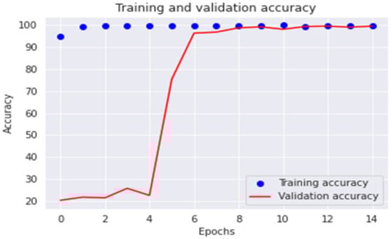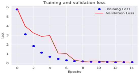 The accuracy and loss are displayed in Figure 8 and Figure 9 for every epoch of the training and validation sample. As shown in Figure 8, the model accuracy is constant and roughly comparable to the training and validation datasets after epoch 4. Furthermore, between epochs 7 and 14, the model loss is significantly reduced and almost equal for both the training and validation sample, as shown in Figure 9. This suggests that the proposed model is free of the well-known overfitting issue.
