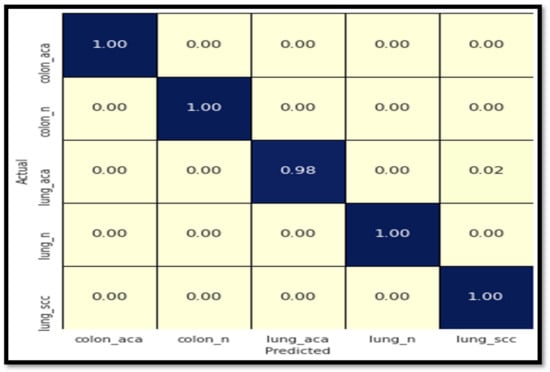 Figure 10 shows the confusion matrix for colon and lung cancer classes using the ResNet101 model classification problem. Figure 10 clarifies that all photos of colon cancer are correctly classified, whereas photographs of lung cancer are incorrectly classified. Just 2% of lung_aca photos were incorrectly categorized as lung_scc images. It is, therefore, fantastic that additional lung cancer photos were incorrectly categorized under different disease groups. Apparently, the network confuses lung cancer images with colon cancer images.