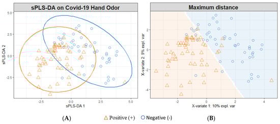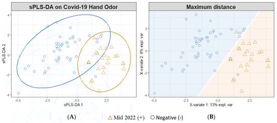 Mid-2022 sPLS-DA Model; (+) Mid-2022 Hand Odor Samples vs. (−) SARS-CoV-2 Samples. (A) Individual sample plot; ellipses = 95% CI. (B) Individual sample plot; background delineates class assignment.