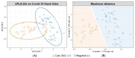 Late-2021 sPLS-DA Model; (+) Late-2021 Hand Odor Samples vs. (−) SARS-CoV-2 Samples. (A) Individual sample plot; ellipses = 95% CI. (B) Individual sample plot; background delineates class assignment.