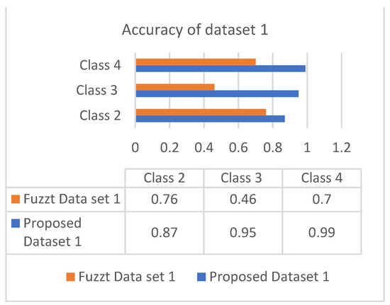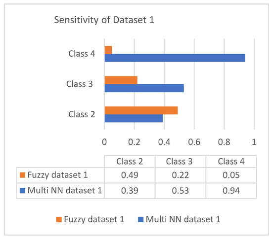 This section discusses the performance analysis of the proposed classification of diabetes types. Specificity, sensitivity, and accuracy are discussed. The evaluation parameters were calculated by testing them with the collected datasets. The performance evaluation was conducted on two datasets that were processed according to the proposed approach. The datasets were tested using the methods of the proposed approach for analyzing the specificity, sensitivity, and accuracy of the proposed approach. The performance evaluation conducted in this section also uses a comparison with an existing work, which is a classification process based on the fuzzy method. The classification is based on three classes: class 2 represents type 1 diabetes; class 3 represents type 2 diabetes; and class 4 represents gestational diabetes. The analysis based on the proposed classification method is shown in the following graphs.