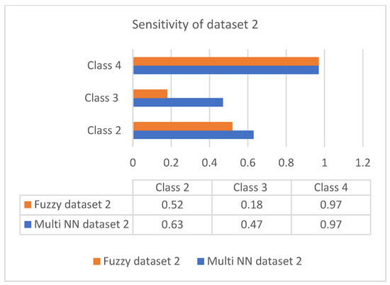 Sensitivity is the process of classifying positive cases correctly, and specificity is the process of classifying negative instances correctly. The confusion matrix for classification is composed of true positive (TP), true negative (TN), false positive (FP), and false negative (FN). The accuracy is measured with measures of sensitivity and specificity. Measures were performed on both the datasets and graphically represented in bar charts. Figure 4 and Figure 5 represent the analysis of the proposed approach based on parameter sensitivity. The study from the graphs shows that in both cases, the sensitivity value varies in nature. In the case of dataset 1, the sensitivity variation shows an incremental nature, while in dataset 2, it shows a zigzag view. The results of sensitivity show that most of the patients are affected by type 2 diabetes. Since class 3 represents gestational diabetes, it is not taken into account. The comparison of the sensitivity values with the multi-layer neural network and fuzzy method shows considerable differences. In both datasets, the proposed method shows more sensitivity than the fuzzy approach. In this case, in dataset 1, the fuzzy method shows slightly better performance for class 2. Furthermore, it differs in specificity from the existing method, and a significant difference is shown only in class 2 and class 3 of dataset 1. In both datasets, the response of specificity shows an incremental nature.