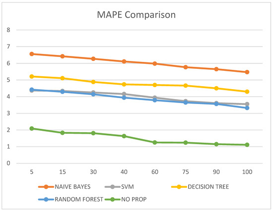 It was also observed that the MAPE value of the proposed no-prop algorithm is lower than any of the other algorithms such as naïve Bayes, SVM, decision tree, and random forest, with a mean error percentage of only 1.11% on the testing data. The MAPE values are illustrated in Table 6 and visualized in Figure 8.