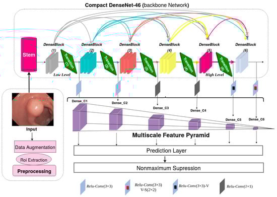 Figure 2 depicts the network structure of DC-SSDNet for the polyp detection task. A redesigned SSD-detector-based compact DenseNet-46 network used as a backbone is proposed to strengthen the network detection ability. The conventional SSD with the VGG16 as a backbone fails to preserve contextual information in the multilayer transmission process. Therefore, unbalanced feature maps appear at each layer. To reuse the rich object information of low-level layers and incorporate it with high-level layers, DC-SSDNet splits the network structure into two sections: a compact version of DenseNet (a DenseNet-46 network as a backbone) for feature reuse and extraction and the front-end network to perform multiscale object detection. Firstly, a preprocessing step is performed to remove the black regions in the WCE images and keep only useful information. Then, a data augmentation strategy is investigated to handle overfitting in deep learning models due to the data insufficiency problem. The model input size is . For object classification and location regression, the conventional SSD model selects VGG-16 layers Conv4_3 and Conv_7 and adds new ones Conv8_2, Conv9_2, Conv10_2, and Conv11_2. Consistent with the SSD network, we construct a multiscale feature pyramid under the premise of maximizing the use of synthetic information from all feature layers and improving precision without sacrificing speed. To improve the model’s detection ability, we use our own multiscale feature pyramid Dense_C1, Dense_C2, Dense_C3, Dense_C4, Dense_C5, and Dense_C6. The main parts of the DC-SSDNet detector are described in detail below.