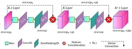 The dense block is the basic unit of the compact DenseNet-46 structure, as shown in Figure 4. We denote the feature maps of the K − 1 layer as , where m and n represent the width and height of feature maps, and means the number of channels. R(·) represents a nonlinear transformation consisting of a rectified linear unit (Relu) as an activation function, a convolution layer, and a convolution layer. It changes the number of channels to k (k = 32) without altering the size of the feature maps. To reduce the number of channels, we used the convolution operation, and we adopted the convolution operation for feature restructuring and to improve the network performance. Each dense block reduces the redundancy of dense connectivity represented by the long dashed arrow, in which feature maps of the K − 1 layer are connected directly to those of the K layer and then make a concatenation with the output of R(·), thus resulting in . The output of the K + 1 layer is . Previous studies based on DenseNet used a fixed number of dense blocks (4 dense blocks in all DenseNet architectures) to keep the same scale of outputs. They also added new layers to each DenseNet network’s dense blocks to increase framework depth. A connectivity increase may decrease network performance due to contextual and semantic information redundancy. For this reason, the proposed DenseNet-46 backbone structure adds two additional dense blocks to increase the network depth rather than increasing the connections of each dense block. The DenseNet-46 backbone structure used in this work has two base blocks in dense blocks (1), three in dense blocks (2), three in dense blocks (3), three in dense blocks (4), two in dense blocks (5), and two in dense blocks (6).