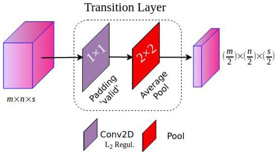 After several dense connections, the number of feature maps of the DenseNet-46 grows dramatically. Consistent with the original DenseNet, we designed transition layer blocks to reduce the dimension of previous dense blocks’ features, as depicted in Figure 5. The transition block includes a convolution layer with valid padding to reduce the number of channels of the previous layers. Then, it performs a 2 × 2 average pooling layer to decrease half of the feature map sizes. In the last phase, the transition block is not used to not reduce the final feature map resolution for further modification related to the SSD output requirements.