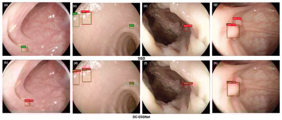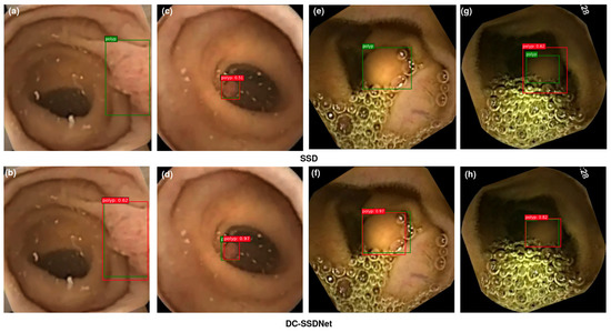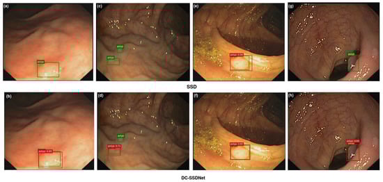 On the WCE test set, visualization results comparing SSD300 (a,c,e,g) and the proposed DC-SSDNet network (b,d,f,h). True bounding boxes with IoU of 0.5 or greater are drawn in green, whereas predicted bounding boxes are in red.