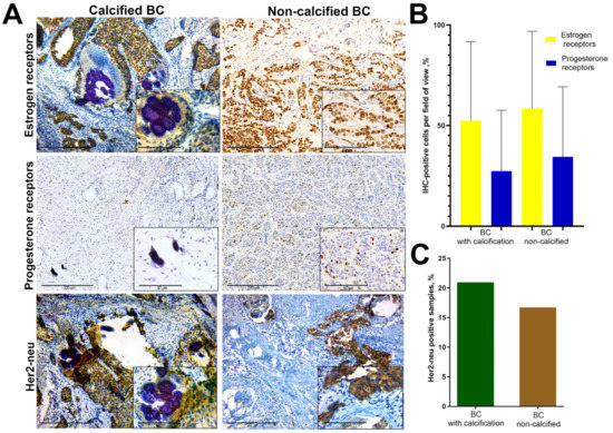 In this study, we examined 469 BC biopsy samples. At the initial stage, each sample was examined by hematoxylin-eosin staining. In 55 samples (11.73%) the presence of biominerals was detected, whereas 414 samples (88.27%) showed no signs of calcification. Calcified samples had 52.45 ± 5.3% ER positive and 27.36 ± 4.08% PR positive BC cells. Non-calcified samples of BC had 58.63 ± 4.25% (p > 0.05) and 34.57 ± 4.74% (p > 0.05) ER and PR positive cells, respectively (Figure 1B).